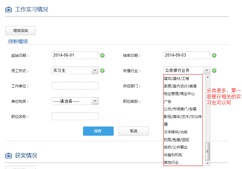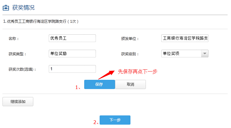 實(shí)習(xí)期間的獲獎情況也可以填,比如優(yōu)秀員工、最佳服務(wù)獎之類的;每一步記得填完都保存下,再往下填。