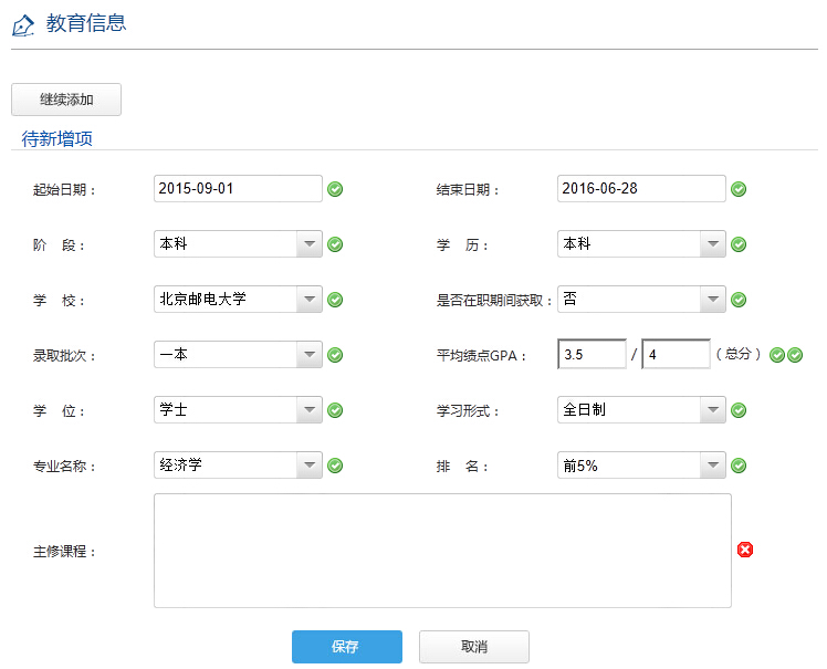 六、填完大學(xué)之后,點(diǎn)擊“繼續(xù)添加”,就可以填高中的信息。階段選成“高中”之后,學(xué)歷等信息就可以直接選“無”,如下圖: