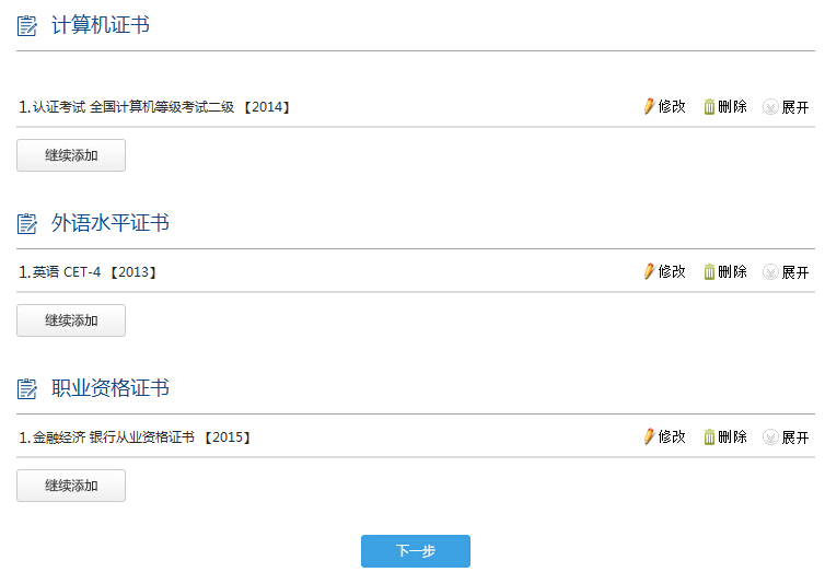 所獲取的各種證書:計(jì)算機(jī)二級、英語四級、從業(yè)資格證等都可以填寫,很多內(nèi)容都直接選擇就行了,很方便;填完后也可以刪除。