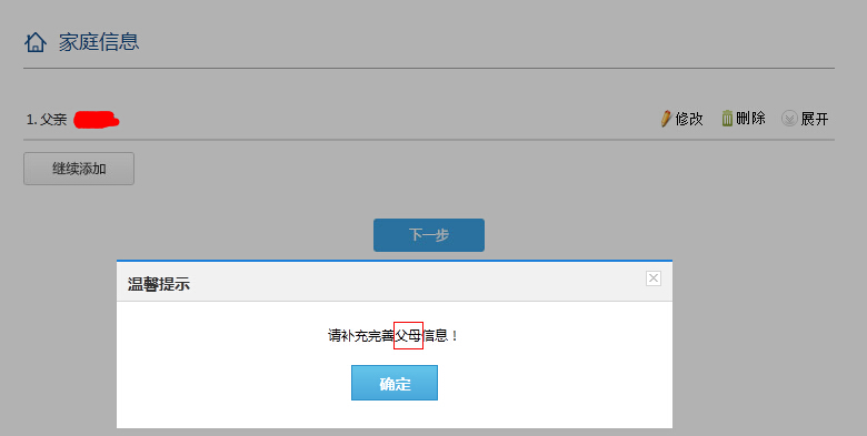 然后就是家庭信息,父母是最基本的,只填一方也不行