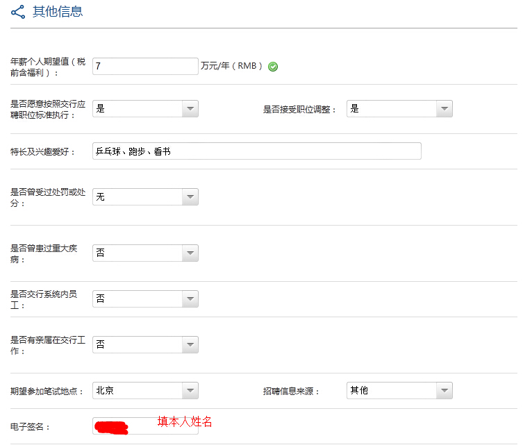 其他信息:期望年薪一般比當(dāng)?shù)仄骄劫Y水平持平即可,筆試地點(diǎn)就近選擇,不一定要去報考的銀行所在地,電子簽名填寫自己的姓名即可。