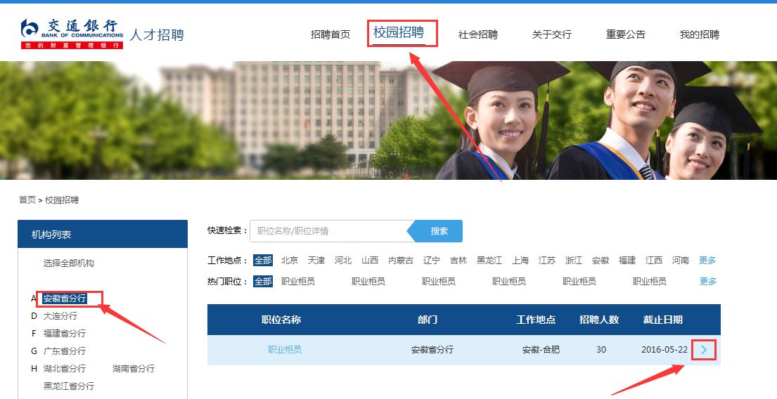 然后點(diǎn)擊校園招聘,選擇自己所要報考的分行,點(diǎn)擊崗位右側(cè)的箭頭即可調(diào)整到崗位申請頁面。(注:簡歷提交后將不能撤銷,切記檢查簡歷是否有錯別字等情況再確認(rèn)提交)