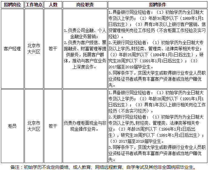 2.符合條件的應聘者將短信(系統短信通知平臺號碼為:95316、10690195316及指定合作的第三方機構短信平臺)或電話通知,應聘者在招聘期間請保持通訊暢通;如未收到相應通知者,即為未入闈,不另行通知。應聘人員資料及信息,北京大興九銀村鎮銀行將嚴格保密。