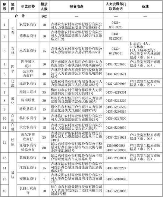 吉林農信2016年招錄計劃及聯系方式見下表