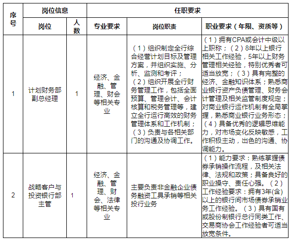 (四)同時(shí)需滿足崗位的任職要求(應(yīng)聘者的工作年限、履職經(jīng)歷、年齡等計(jì)算至2018年12月31日),且符合我行招聘錄用管理的其他相關(guān)政策及規(guī)定。