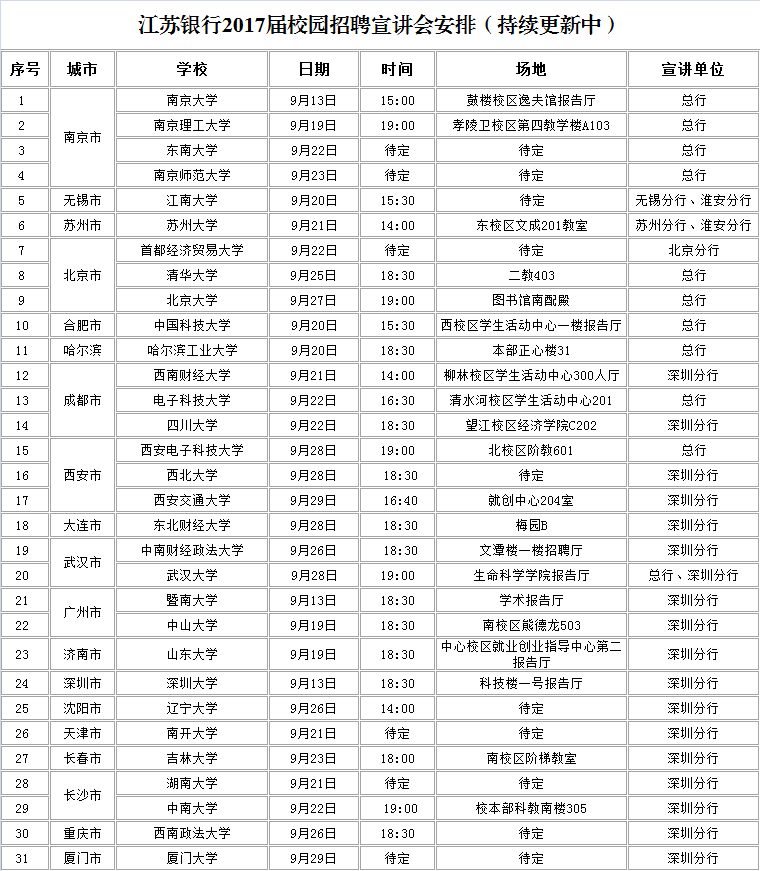 2017年江蘇銀行校園招聘宣講會日程安排已在銀行招聘網發布,詳情如下: