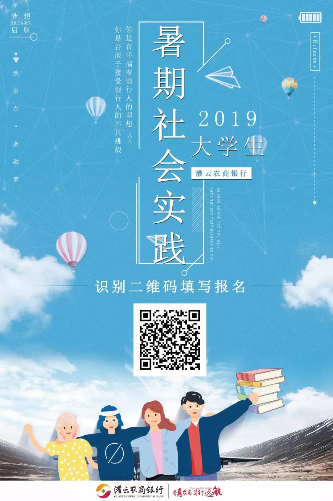 江蘇灌云農村商業銀行是經中國銀監會批準成立的一級法人機構。現有網點36個,網點已覆蓋全縣所有鄉鎮,存、貸款規模穩居地方金融機構之首,是最具有活力和潛力的金融機構。根據業務發展需要,將組織開展“激情盛夏,燃爆自我”為主題的社會實踐活動,招收一批有創新精神,勇于接受挑戰,樂于奉獻的大學生來了解金融知識,實現金融夢。