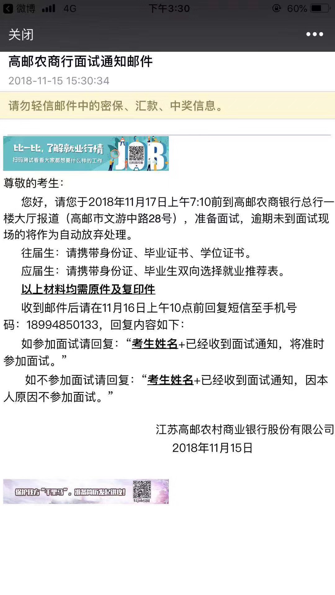 [江蘇]2019年高郵農(nóng)商銀行校園招聘面試通知