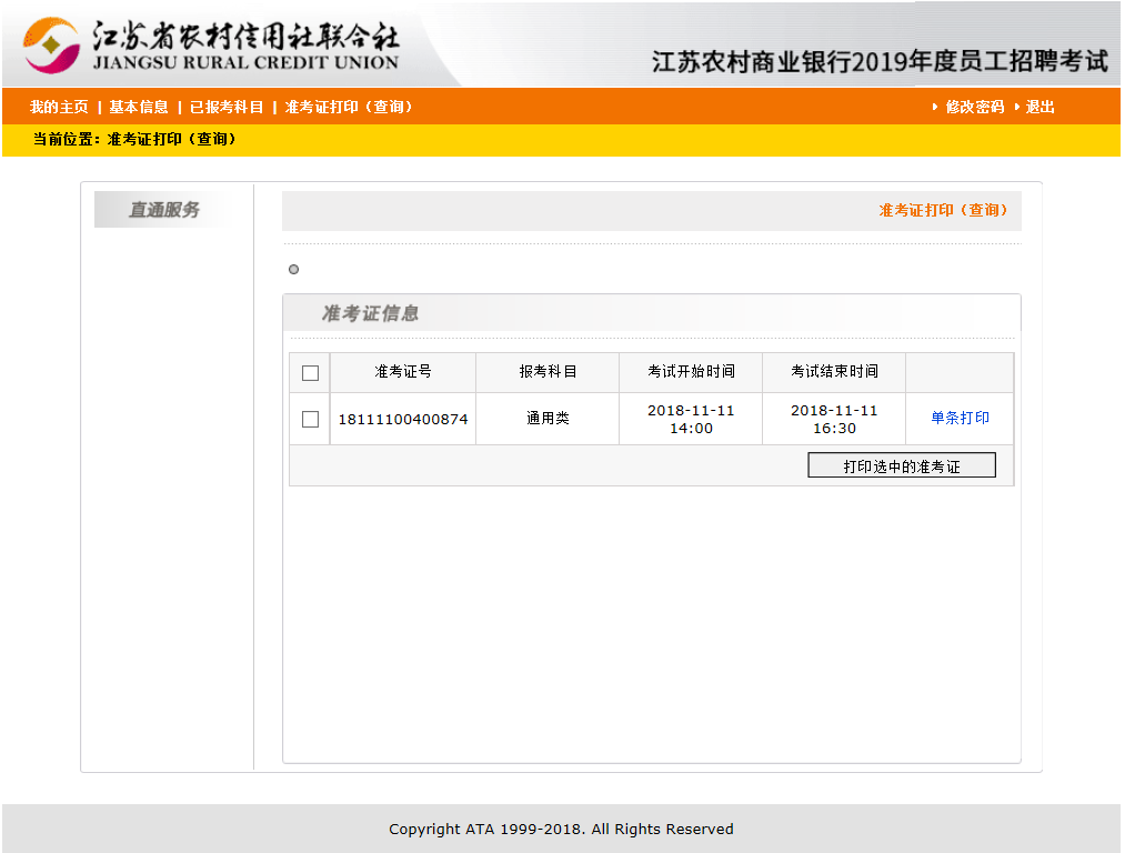 主頁 > 農村信用社招聘 > 江蘇省農村信用社招聘 > [江蘇]2019年江蘇村商業銀行校園招聘準考證打印入口
