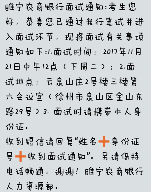 [江蘇]2018年江蘇睢寧農商銀行面試通知