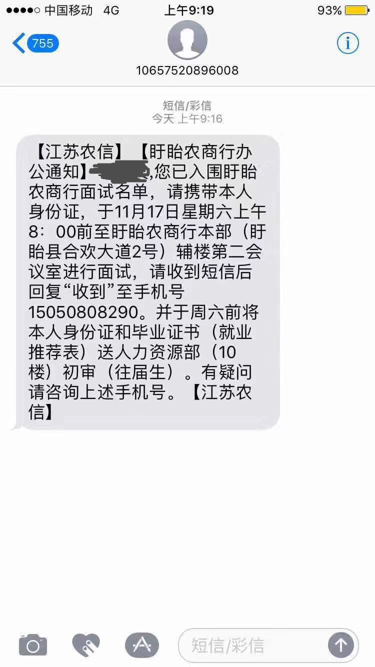 [江蘇]2019年盱眙農(nóng)商銀行校園招聘面試通知