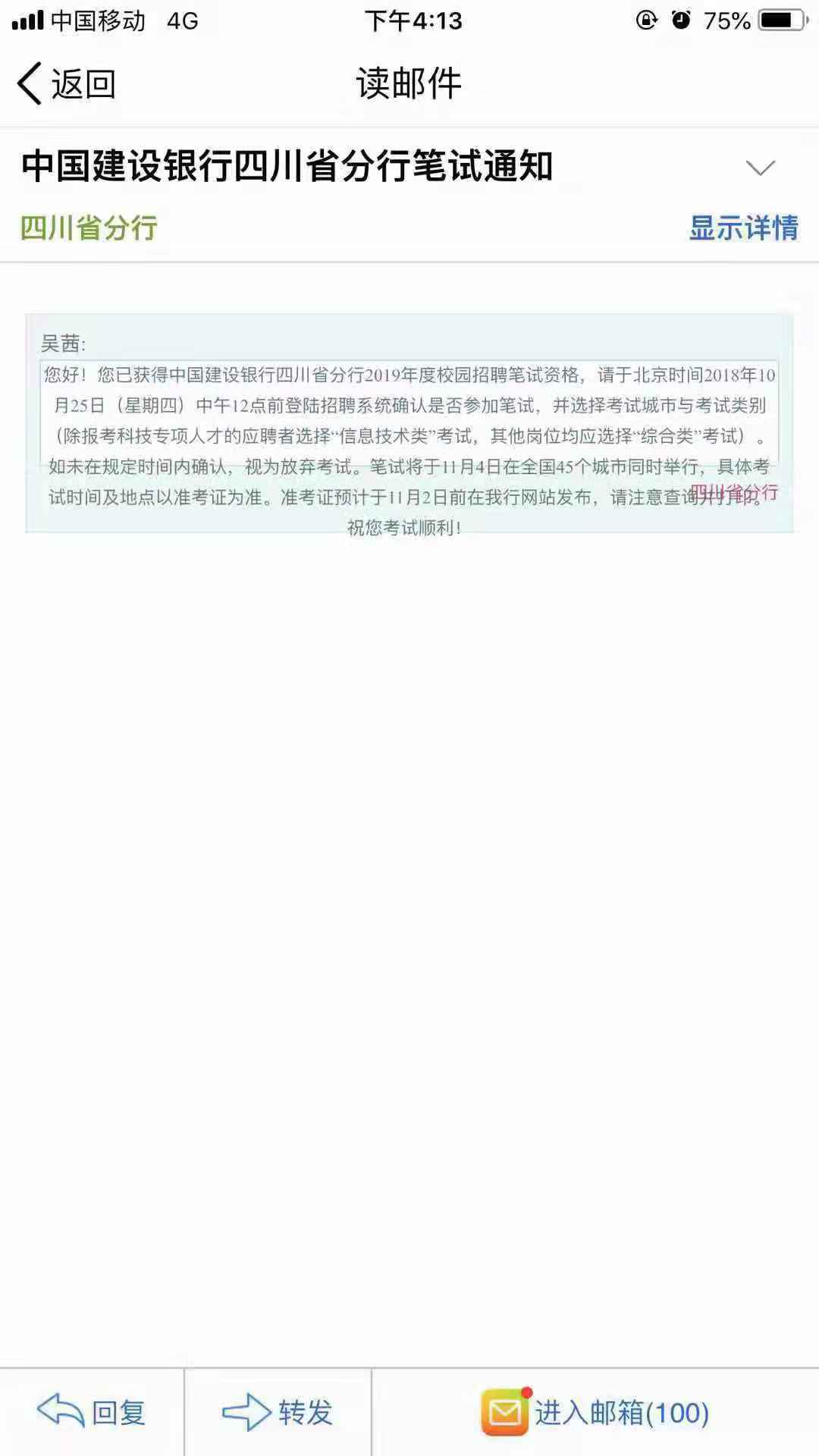 [四川]2019年中國建設銀行四川省分行校園招聘筆試通知