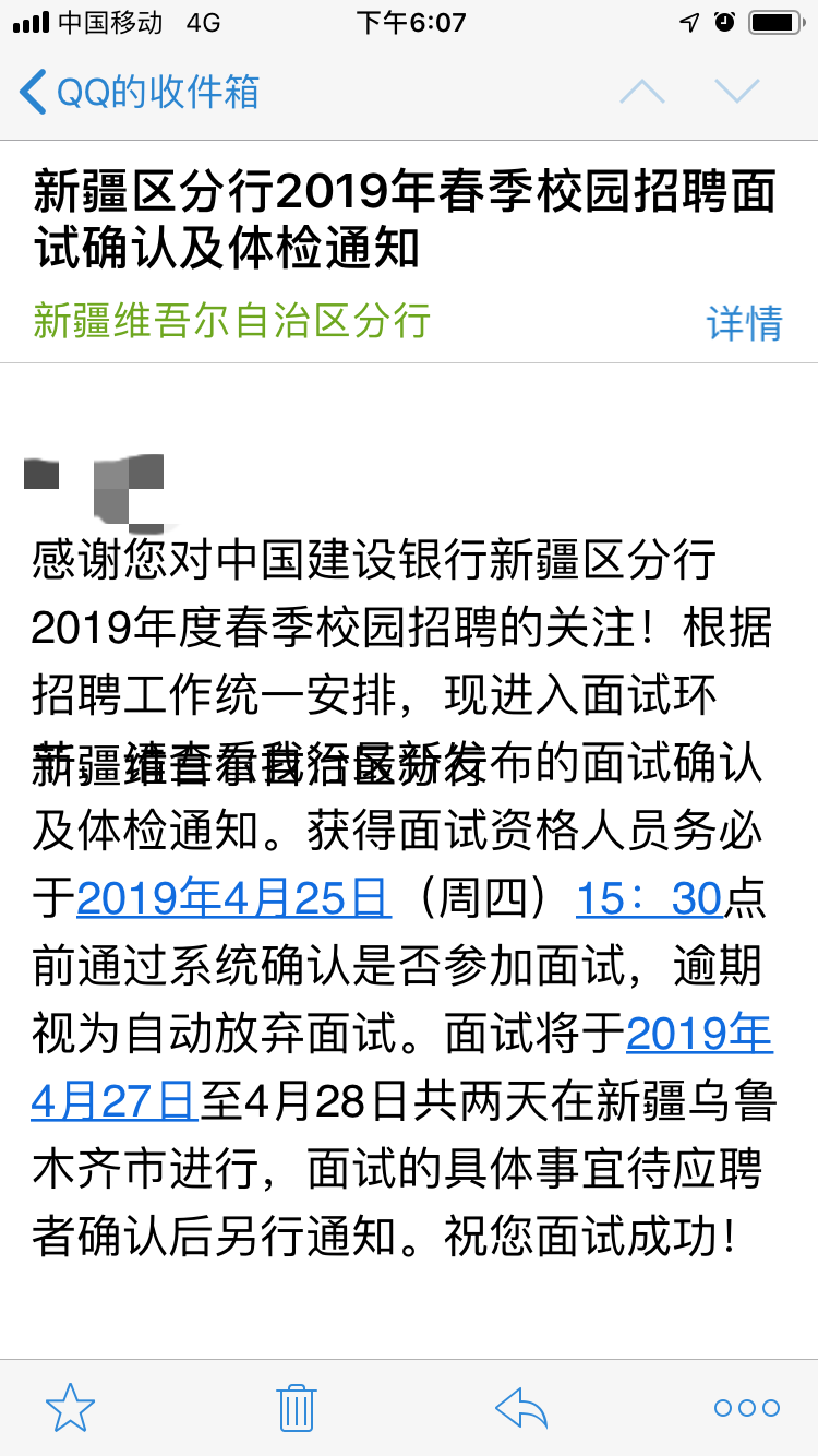 2019年中國建設銀行新疆區(qū)分行春季校園招聘面試確認以及體檢通知