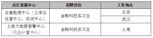 金融科技實習生:主要參與金融科技課題研究、大數據分析與應用、金融科技項目開發建設等工作。