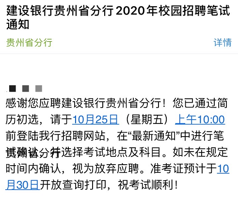 [貴州]2020中國建設銀行貴州分行校園招聘筆試通知