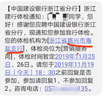 [浙江]2020年中國建設(shè)銀行浙江分行校園招聘體檢通知