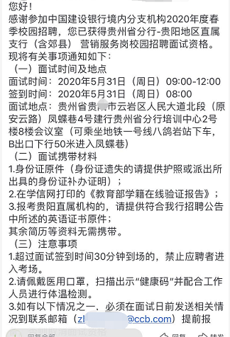2020年中國建設銀行貴州省分行營銷服務崗春季校園招聘面試通知公告