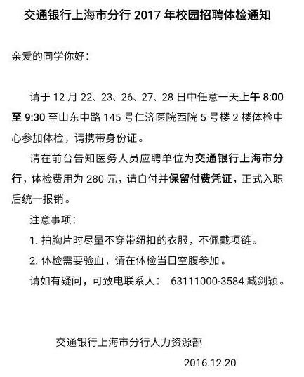 [上海]2017年交通銀行上海分行校園招聘體檢通知