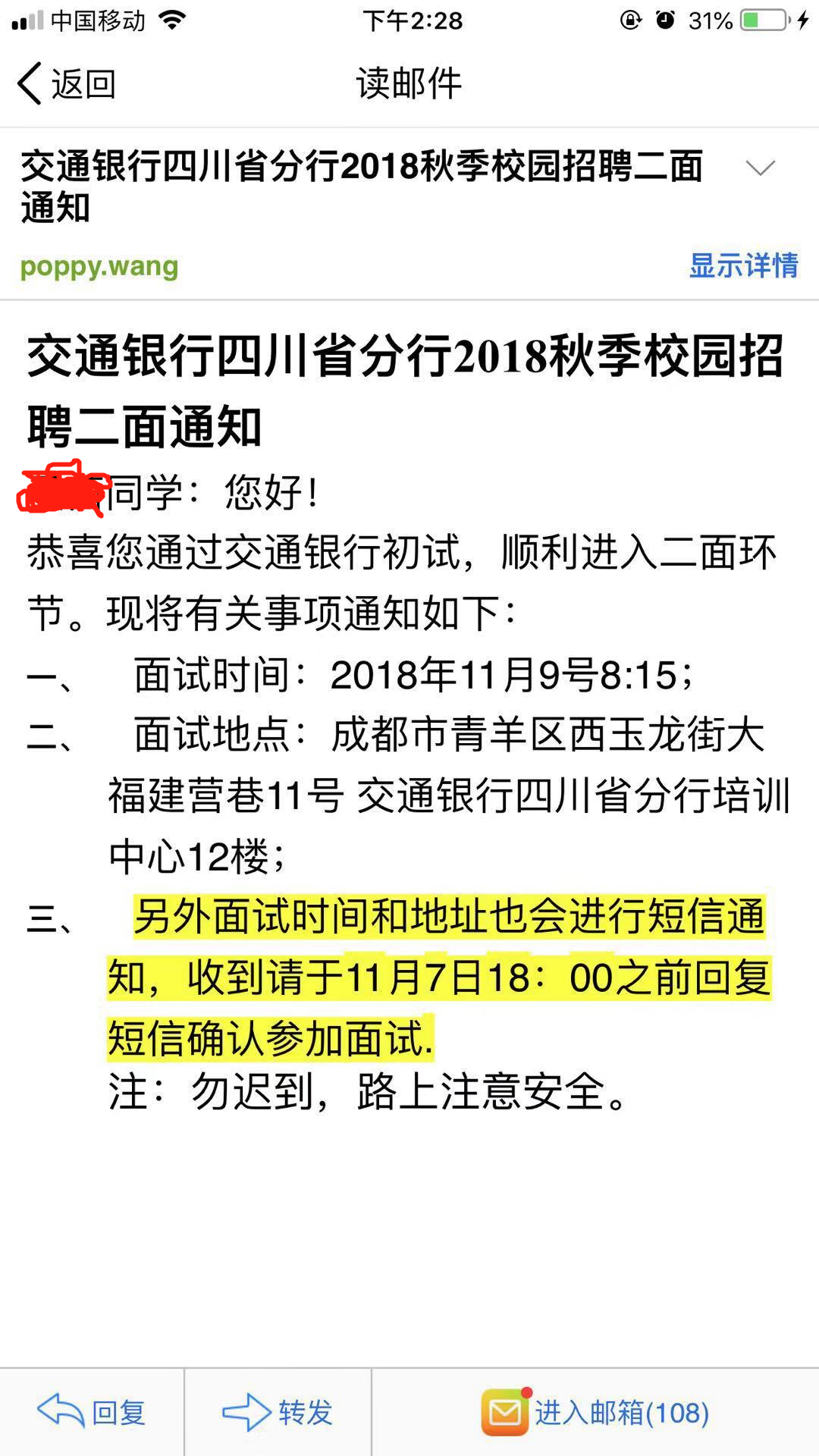 [四川]2018年交通銀行四川省分行秋季校園招聘二面通知
