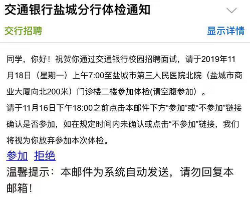 [江蘇]2020交通銀行鹽城分行校園招聘面試通知