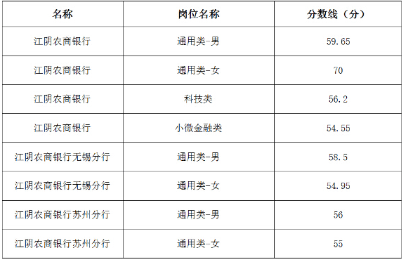 [江蘇]2018年江蘇江陰農商銀行校園招聘面試分數線