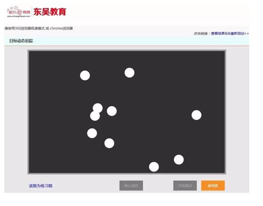 屏幕上會出現10個圓球,其中有3-5個圓球將閃爍,閃爍的圓球即為需要追蹤的目標,請記住它們。追蹤目標閃爍后,10個圓球都會運動;但圓球運動停止后它們會變成正方形,請用鼠標選出之前閃爍的追蹤目標進行作答。鼠標點擊一次即為選中,被選中的目標顯示橙色邊框,在點擊一次則取消選擇。