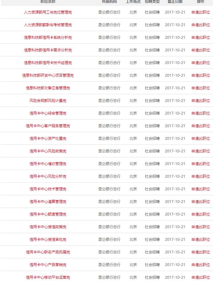 4. 信用卡中心:消費信貸管理崗、分期業務管理崗、受理市場拓展崗、移動平臺運營崗、產品營銷崗、聯名產品拓展崗、授信審批崗、授信政策崗、額度管理崗、風險分析崗、清算管理崗、技術管理崗、催收管理崗、風險政策崗、資產處置崗、客戶服務管理崗、綜合管理崗。