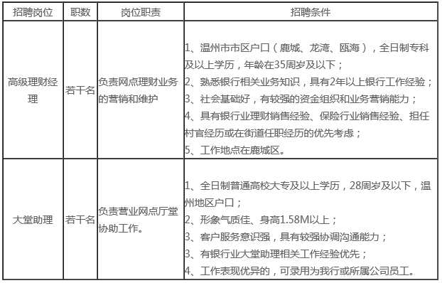 浙江溫州鹿城農(nóng)村商業(yè)銀行股份有限公司是一家經(jīng)中國銀監(jiān)會批準(zhǔn)的股份制商業(yè)銀行。截至2016年末,鹿城農(nóng)商銀行及其主發(fā)起的各地富民村鎮(zhèn)銀行資產(chǎn)總規(guī)模超500億元,在鹿城區(qū)擁有營業(yè)網(wǎng)點47家,在崗員工800多人,榮獲了“全國農(nóng)村商業(yè)銀行標(biāo)桿銀行”榮譽(yù)稱號。因全行業(yè)務(wù)發(fā)展需要,現(xiàn)面向社會招聘高級理財經(jīng)理和大堂助理若干名。