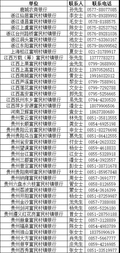 工作地點:浙江東陽富民村鎮銀行;江西高安、上栗富民村鎮銀行;貴州納雍、望謨、紫云、劍河富民村鎮銀行;河南衛輝富民村鎮銀行。