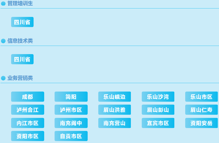 眉山洪雅、仁壽及彭山。 應聘人員需服從本行對工作地點的調配,全日制本科生工作地點為縣級支行;重點院校本科及以上學歷工作地點為各分行;管理培訓生,作為總行和分行員工儲備生,結束統一培訓期并考察合格后優先選派到總行和分行相關部門工作。