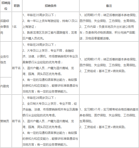 龍灣農(nóng)商銀行因業(yè)務發(fā)展需要,特向社會公開招聘后勤綜合事務崗、業(yè)務引導員、內(nèi)勤崗、營銷員、等崗位人員,熱忱歡迎有志之士加盟。