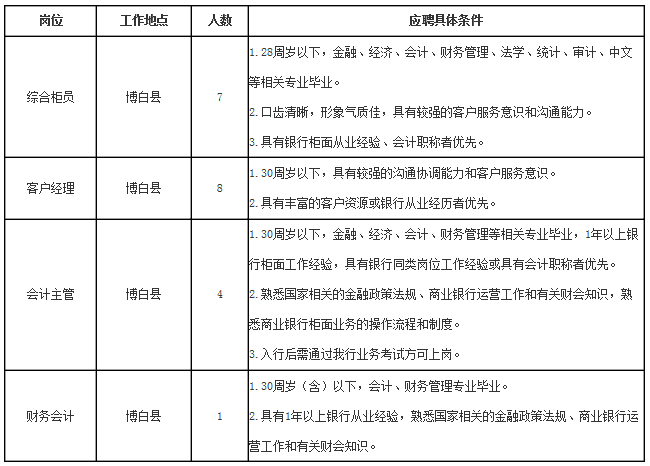 (一)身體健康,具有全日制大學(xué)專科(含)以上學(xué)歷,立志在廣西博白柳銀村鎮(zhèn)銀行長期發(fā)展。