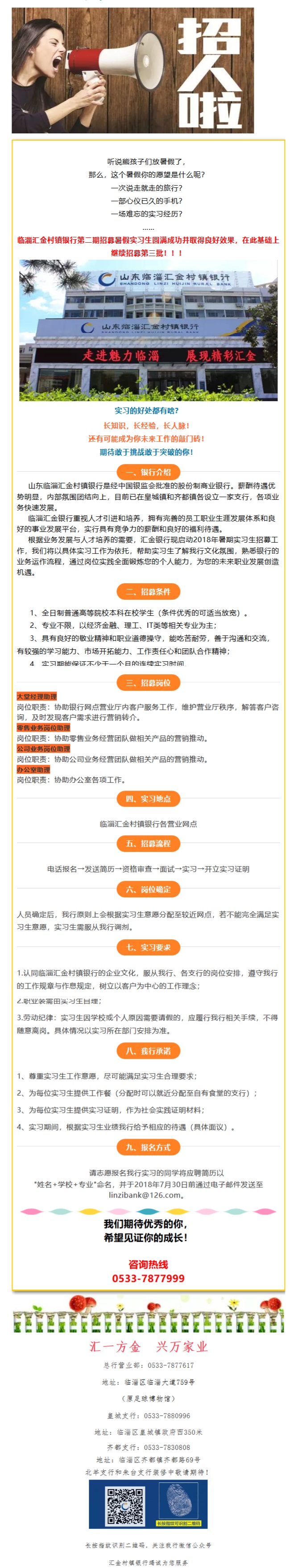 [山東]2018年臨淄匯金村鎮(zhèn)銀行暑假實習(xí)生招募公告