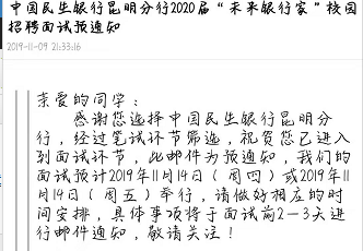 2020年中國民生銀行昆明分行校園招聘面試通知公告