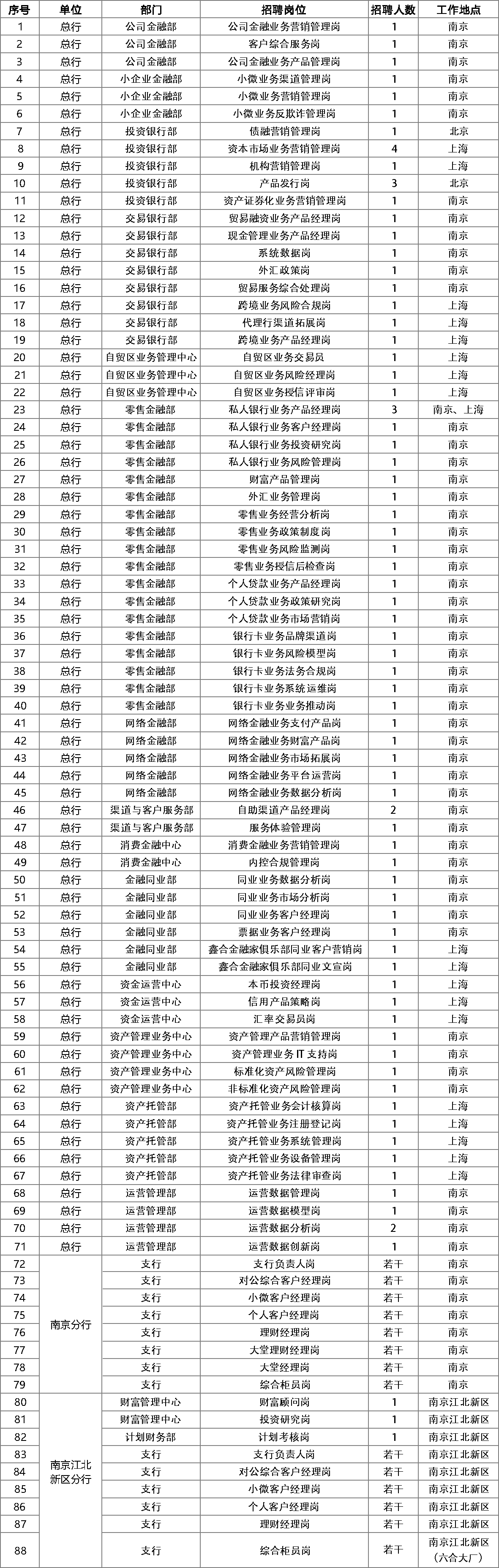 企業興盛,重在人才;百年基業,才聚業興。偉大的事業匯聚優秀的人才,精彩的舞臺召喚共進的伙伴。南京銀行已進入歷史最好發展時期,胸懷打造“中國一流綜合金融服務商”的戰略愿景,正闊步邁向現代中型商業銀行的新征程。現虛席88個工作崗位,誠聘金融同業精英。