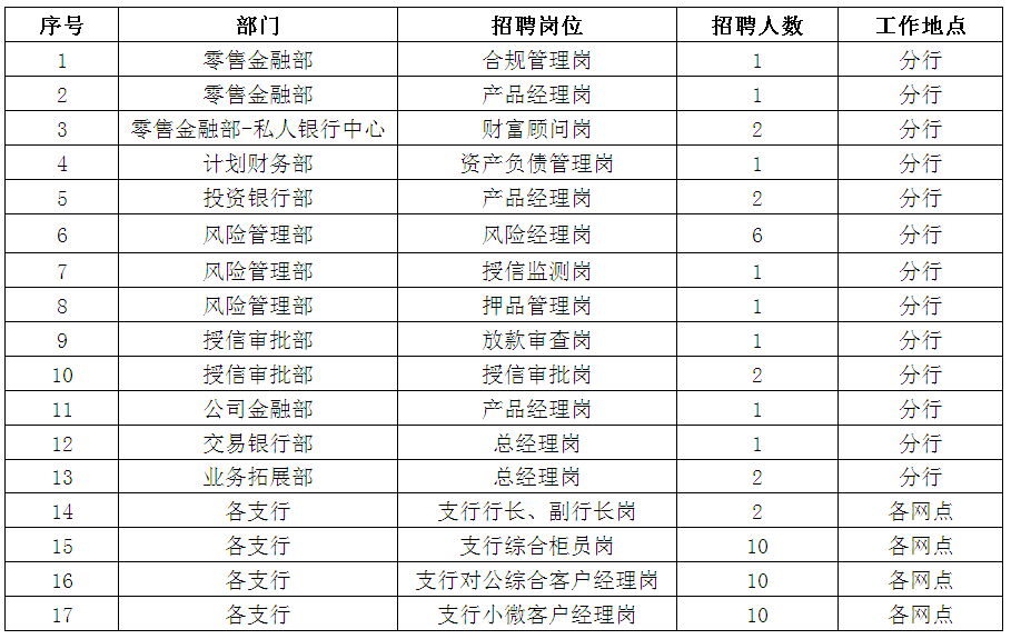 因業務發展及支行籌建需要,現誠邀業界英才加盟,共同開創美好的事業。我們將為您提供良好的職業發展環境和具有較高市場競爭力的薪酬福利待遇,實現員工和本行事業的共同成長!