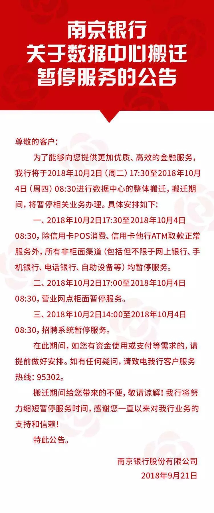 由于我行數據中心搬遷暫停服務(具體公告請見下圖),我行招聘系統及招聘官網將于2018年10月2日(周二)14:00至2018年10月4日8:30暫停對外服務,期間將無法訪問南京銀行招聘官網https://job.njcb.com.cn,也無法進行注冊投遞。