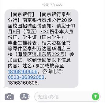 [江蘇]2019年南京銀行泰州分行校園招聘面試通知