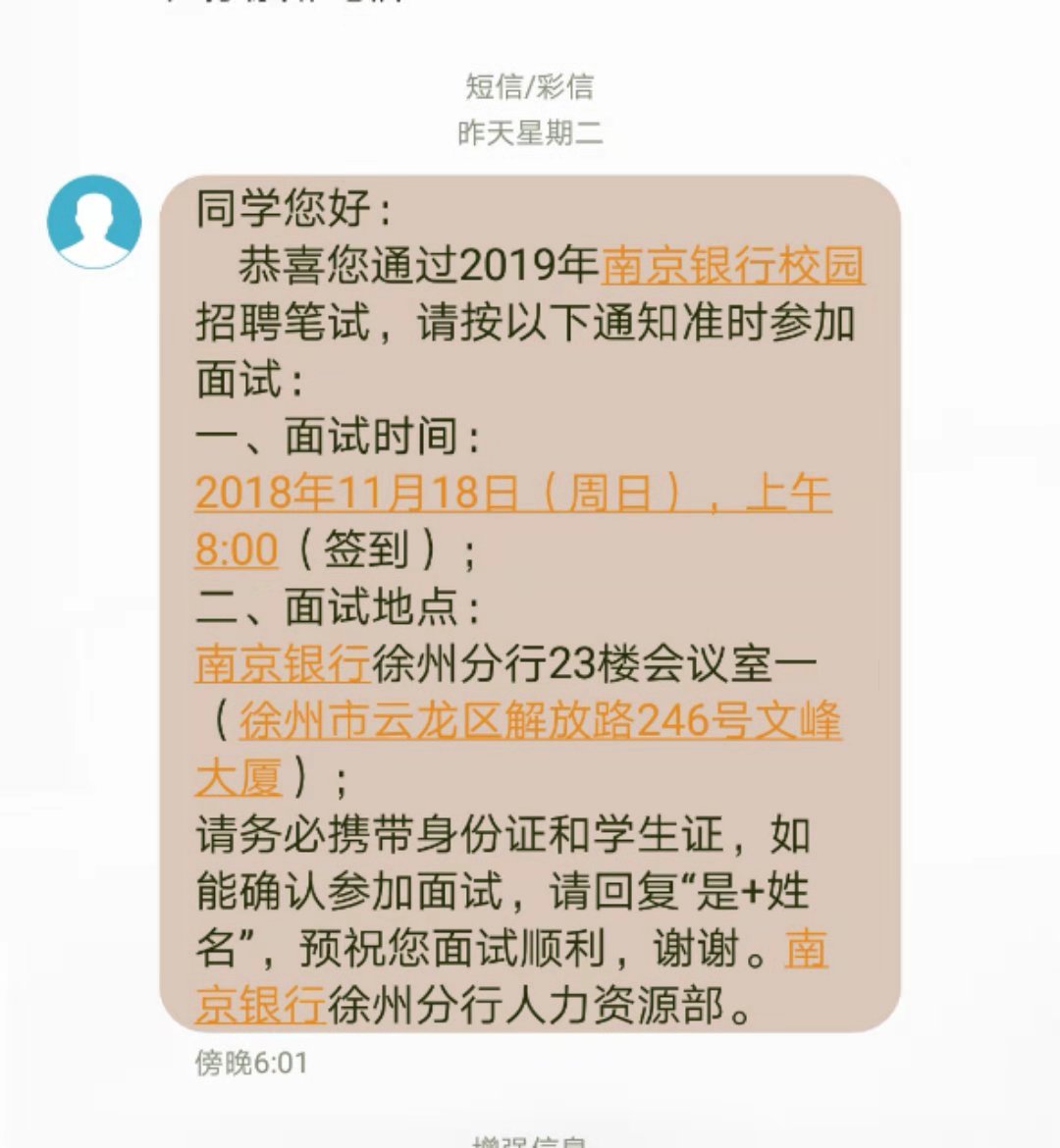 [江蘇]2019年南京銀行徐州分行校園招聘面試通知