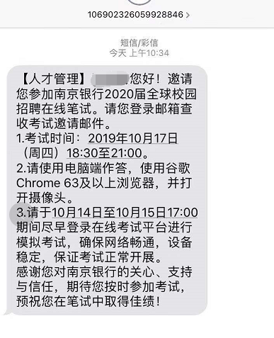[全國]2020南京銀行全球校園招聘在線筆試通知