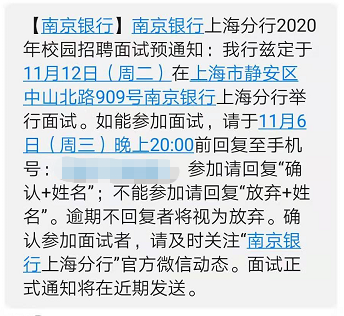 [上海]2020年南京銀行上海分行校園招聘面試預通知