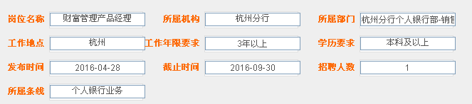 35周歲及以下,全日制本科及以上學歷,3年及以上銀行相關工作經驗;具有較強的營銷策劃和市場推廣能力,較強的表達能力、溝通協調能力、團隊合作能力,