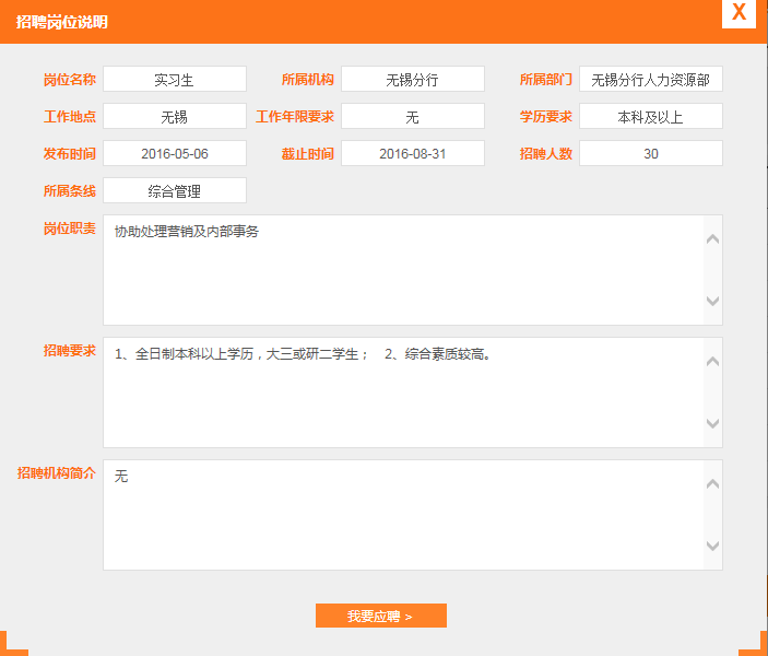 主頁 > 城市商業銀行招聘 > 寧波銀行招聘 > [江蘇]2016年寧波銀行無錫分行實習生招聘公告