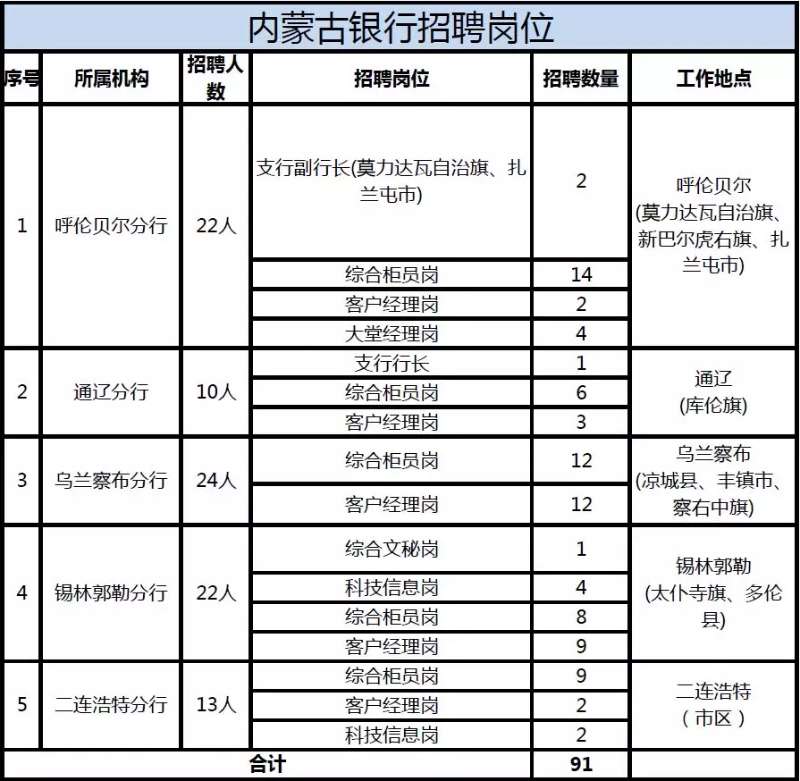 烏蘭察布分行24人,二連浩特分行13人,具體工作地點及招聘崗位見下表。
