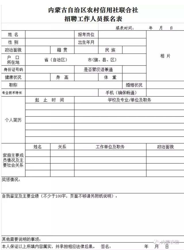 報名方式:登陸內蒙古人才網(http://www.nmgrc.com)或內蒙古自治區農村信用社聯合社門戶網站(http://www.nmgnxs.com.cn),點擊《內蒙古自治區農村信用社聯合社招聘工作人員報名專欄》,填寫《內蒙古自治區農村信用社聯合社招聘工作人員報名登記表》(本人簽字),將“報名登記表掃描件、本人身份證掃描件、學歷學位證書掃描件和相關資質證書掃描件”共4份材料投遞至自治區聯社招聘專用郵箱(nmnxzp_2017@163.com)進行報名。