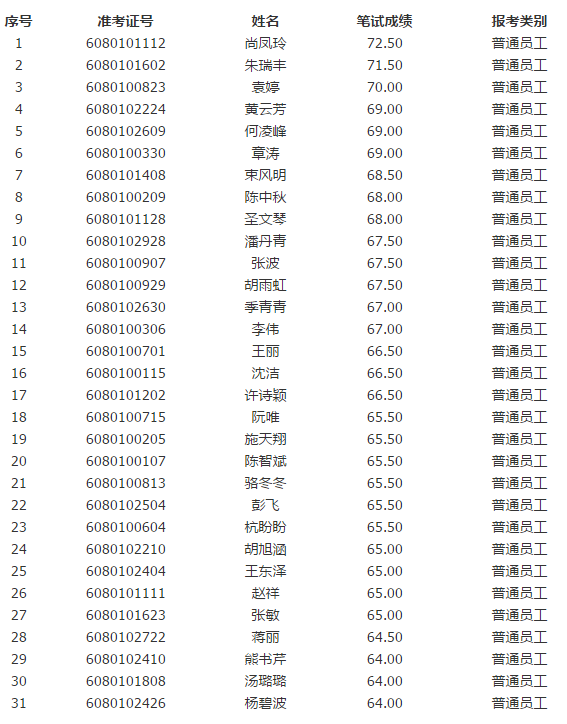 一、面試入圍人員:共31名(最后一名入圍面試人員筆試成績有3人并列64分,一同入圍面試),具體名單見參加面試人員名單。