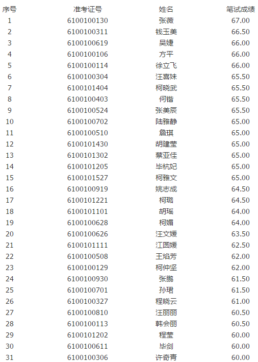 一、面試入圍人員:共31 名(最后一名入圍面試人員筆試成績有并列,一同入圍面試),具體名單見附件。