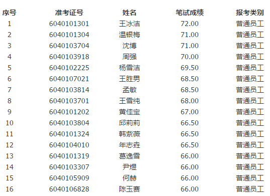 根據省聯社《關于<印發安徽農村商業銀行系統員工招聘管理辦法>的通知》(皖農信聯發〔2016〕51號)、《關于安徽農村商業銀行系統2016年度員工招聘工作有關事項的通知》(皖農信聯秘〔2016〕14號)和《關于做好2016年面向社會統一招聘員工面試組織工作的通知》文件精神和規定,我行依據考生筆試成績從高分到低分的順序,按照1:1.5比例核定面試入圍人員名單。現將筆試入圍參加面試人員名單進行公示,公示期限三天。歡迎監督。