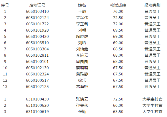 一、面試入圍人員:普通員工共13名(最后一名入圍面試人員筆試成績有并列,一同入圍面試),大學生村官共3名,具體名單見附件。