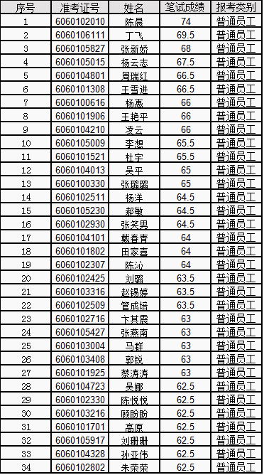 根據《明光農商銀行2016年員工招聘公告》,依據考生筆試成績從高分到低分的順序(考生可登錄安徽農金招聘系統自行查詢筆試成績,本行不再另行電話通知),按照1:1.5比例核定面試入圍人員名單,2016年我行面向社會招聘普通員工面試入圍分數線為“ 62.5 分”;法律、計算機專業報考入圍人員名單詳見安徽省聯社在招聘系統公告通知。現將相關事項通知如下: